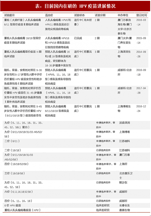 目前国内有 5 家企业的 hpv 疫苗研究已进入临床阶段,其中沃森生物子公司上海泽润生物科技有限公司的 hpv 二价疫苗已处于临床ⅲ期试验的关键时期,已完成全程 3 针的接种工作,正处于收集分析临床结果判定终点即癌前病变ⅱ期(cin2)病例样本的最后阶段,研发进度国内领先。另外厦门万台沧海生物、上海博唯生物、成都所/北京所等的研发也处于临床的不同进展阶段,上市公司除沃森等以外长生生物、康泰生物等也在研发上有所布局。