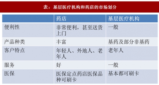3、基层医疗机构和药店的市场划分基本明确