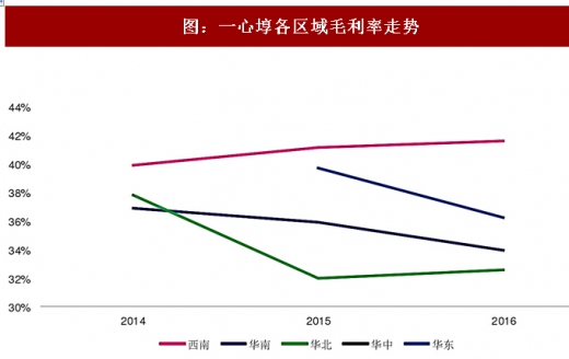药店企业的并购行为有利于快速在某地级市形成规模优势,体现为在该区域的采购成本更有优势。例如一心埻在收入规模占比82%的西南区域,毛利率高于其他区域几个百分点。