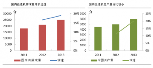 2011 年、2012 年和 2013 年,国内血液透析机产品的需求量分别约为 1.8 万台、2.1 万台和 2.5 万台,2012 年和 2013 年与上年相比分别大幅增长 16.67%和 19.05%。国内国产血液透析机产量分别为 4500台、5000 台和 6000 台,2012 年和 2013 年与上年相比分别大幅增长 11.11%和20.00%