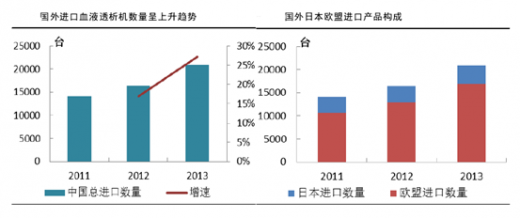 国外进口血透机产品数量在 2011 年至 2013 年期间分别为 1.4 万台、1.6万台和 2 万台,2012 年、2013 年与上年相比分别大幅增长 16.90%和 27.18%。国外进口产品的绝对数量呈持续大幅增长态势。
