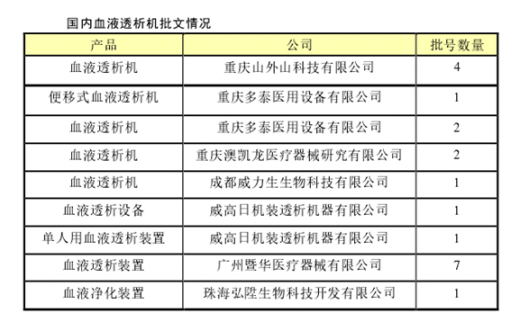 目前,我国生产血液透析机的生产企业有七家,包括重庆山外山科技有限公司、广州暨华医疗器械有限公司、重庆多泰医用设备有限公司、成都威力生生物科技有限公司、重庆奥凯龙医疗器械研究有限公司、珠海弘陞生物科技开发有限公司、威高日机装(威海)透析机器有限公司等,其中威高日机装(威海)透析机器有限公司是日本参与投资的合资企业。