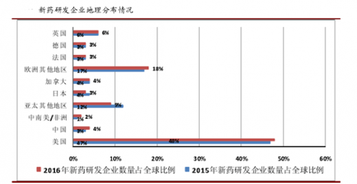 从目前全球新药研发企业的分布来看,美国和欧洲地区的制药企业仍是全球新药研发的主要动力来源,在全球新药研发领域占据了高端地位。但是在亚洲,2016 年中国的新药研发企业数量不仅已超过韩国,而且超过了传统制药强国日本,同时也已超过德国和法国,成为全球第四大新药研发国。近年来,我国政府推出了一系列鼓励新药研发的政策,例如“重大新药创制”科技重大专项,优先审批审评等政策,在新药的研发、注册审批、资金投入等环节上给予支持。预计在未来,将有越来越多的医药企业进入到新药研发领域,在研新药的数量有望进入快速增长阶段。我们认为,本土医药外包将成为 cmo 行业一片新的蓝海市场。