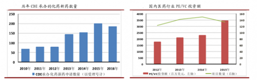 从近年来新药(包括原 1.1 类化药和现 1 类化药)的申请的数量上来看,新药注册申请数量(受理号计)从 2010 年起就逐年上升,2016 年 1-10 月新药申请达到了 186 个。与此同时近年来医药行业的 pe/vc 投资额也在逐步增加,诞生了一批专注于新药研发的中小型医药企业。随着近年来申报的药物陆续进入临床研究和商业化生产,这些中小型医药企业会通过 cmo 企业进行原料药以及制剂的生产。我们认为,未来伴随着本土创新性医药企业的成长,国内医药外包服务将成为 cmo 行业一片新的蓝海市场。