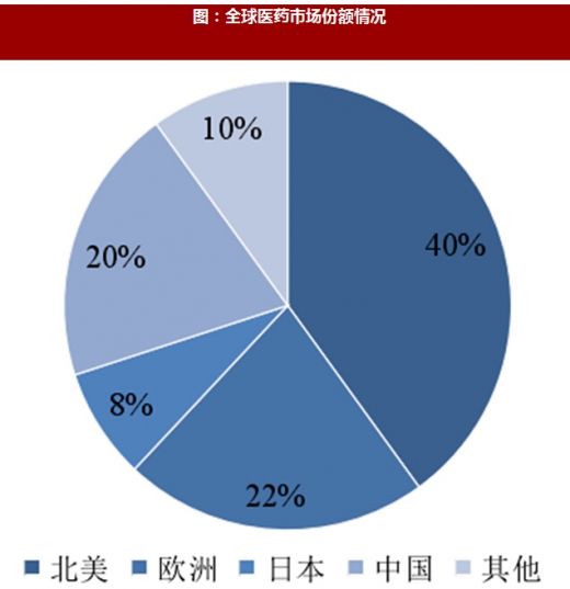 从地域分布来看,在全球范围内北美市场占据全球药品市场接近40%的份额,美国仍是第一大市场。受人口增长、经济发展以及各类新药在发展中国家逐渐普及的影响,新兴医药市场发展速度要显著快于发达国家。而中国是新兴医药市场的领头羊,贡献了主要的医药市场增量,在全球药品市场占比20%。