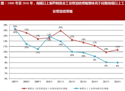 医药工业是我国国民经济的重要组成部分。受益于我国经济快速增长、国民收入持续提高以及医疗改革深入等因素,我国医药行业保持了较快的增长速度。近十年来,我国医药工业总产值快速增长,2006年至今规模以上医药制造业工业增加值增速均高于10%,总体高于同期规模以上工业增加值增幅。
