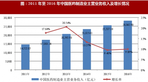 2011年一2016年,我国医药制造产业的主营业务收入从14,522亿元增长至28,063亿元,年复合增长率达14.08%,远高于同期gdp增长率。