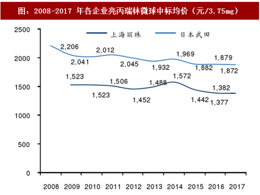 国产产品逐步进口替代。自 2009 年上市后,由于价格优势,上海丽珠和北京伯恩特保持较快增速,2012-2016 年上海丽珠的复合增速达 64%,北京伯恩特的复合增速达 48%,武田增速放缓明显,市占率逐年下降。除已经上市的国产品种外,目前有先兆药物微球产品申请临床获批。