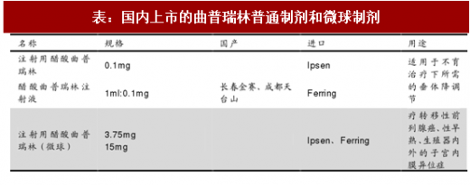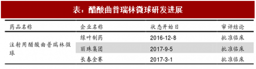 曲普瑞林微球在研包括绿叶、丽珠集团和长春高新,距离上市仍有一段时间。目前国内市场曲普瑞林微球为进口产品,国内在研产品公司包括绿叶制药、丽珠集团和长春金赛,分别在 2016-2017 年获批临床,预计国产品种上市仍需3 年以后。