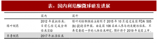 国内药企中绿叶、齐鲁进展领先。绿叶利培酮微球注射剂在国内已经完成临床试验,并于 2015 年 10 月通过美国 fda 505 (b) (2)途径申报,由美国 108 名病人参与的关键性临床实验足以支持 ly03004 通过 505(b)(2)的途径在美国提交新药上市申请(nda),不再需要进一步的人体临床研究。齐鲁制药的利培酮微球则于 2017 年 4 月在国内批准临床。