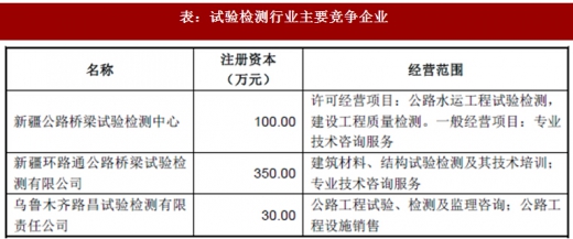 受各地住建委对本行政区域内建材检测机构业务活动有效性的管理、建筑材料本身运输半径和品牌影响力的制约,公路质量检测服务具有较强的地域性特征,即检测行业的竞争呈现以省市为单位的区域特征。目前疆内从事试验检测业务的公司主要有新疆公路桥梁试验检测中心、新疆环路通公路桥梁试验检测有限公司和乌鲁木齐路昌试验检测有限责任公司等,其主要情况如下: