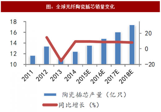 2014年全球光纤陶瓷插芯产量达12.4亿只,同比增长9.73%,根据中国电子元件协会预测,17年全年全球光纤陶瓷插芯的产量可以达到16.1亿只,按一只陶瓷插芯使用5g纳米复合氧化锆粉体计算,17年全球需要纳米复合氧化锆粉体8,050吨,按200,000元/吨价格计算,全球陶瓷插芯用纳米复合氧化锆粉体的市场规模可以达到16.1亿元。