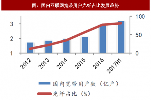 同时,光纤陶瓷插芯市场增长动力强劲,截止17年6月,我国网民总数突破7.5个亿,占世界总量五分之一左右,其中很大程度上得益于我国宽带事业的迅速发展。近年来中国互联网宽带用户数快速增长,光纤入户进程也同时加快,2016年国内宽带用户数达2.97亿户,其中光纤接入(ftth/0)用户占宽带用户的比重超过了76%,2017年上半年光纤占比更是突破了80%,未来随着国内互联网宽带的进一步普及以及光纤入户工程加速,将带动光纤陶瓷插芯需求的快速增长,陶瓷插芯用纳米复合氧化锆市场规模还将继续扩大。