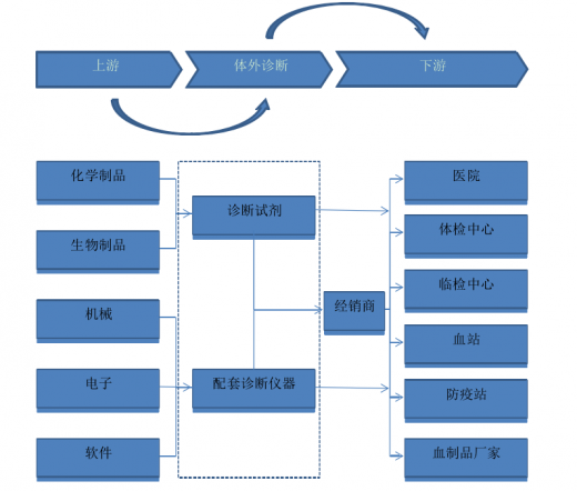 体外诊断行业的产品由诊断仪器及其配套使用的诊断试剂组成。仪器的上游主要包括机械、电子、软件等产品行业,试剂的上游主要包括化学制品与抗原、抗体、酶、血清等生物制品行业。