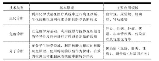 根据临床医学检验项目所用技术的不同,体外诊断产品可分为临床生化、免疫诊断、血糖检测、血液学、微生物学、分子诊断等类别,其中临床生化、免疫诊断和分子诊断代表了目前临床应用中的主流技术。各类技术均由相应的仪器与试剂组成完整的诊断系统。主流技术简介如下:
