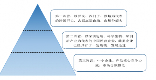 国内市场处于快速成长期,产业集中度和竞争实力稳步提升,与国外企业差距在缩小。国外大企业产品质量优势明显、自动化程度高,在国内三级医院的高端市场占据垄断地位。国产产品则具有价格较低、金沙下载送彩金的售后服务完善的优势,用户集中在二级医院和基层医院的中低端市场,并逐步向三级医院渗透。目前国内市场整个行业可以分为三个竞争层次。