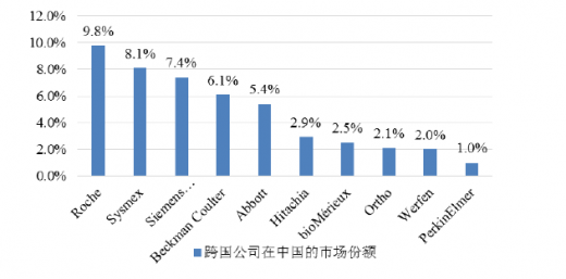 进口品牌依靠先进的技术、品牌优势、稳定的质量,占据我国体外诊断市场56%的份额。其中罗氏2015年的市场份额为9.8%,处于市场领先地位;希森美康、西门子、贝克曼、雅培的市场份额分别为8.1%、7.4%、6.1%和5.4%。前五大国外企业的体外诊断业务占据国内市场36.8%的市场份额。