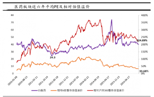 目前,医药板块整体估值为40倍左右,相对沪深300指数的估值溢价已经从14年的370%高位回落至最近的220%,但纵向比较10年以前的估值溢价,同时考虑到目前行业增速只有10%左右,我们认为当前行业整体估值仍然偏高。
