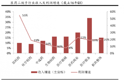 2016年1-10月,医药累计实现收入2.23万亿,累计实现利润收入2356亿,分别同比增长9.7%和15.5%,同时1-10月的行业收入增速较今年1-9月持平,利润增速相比有所提高,行业的盈利能力进一步增强。预计16全年和17年行业收入增速可保持在10%-15%之间。