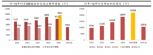15年开始,药审中心多措并举,包括优化审批流程、多渠道扩增审评力量等,全力解决审评任务积压。15年是审评积压关键的转折之年,全年审批完成数首次超过申请数1300多个,积压数量由15年高峰时期2.2万个降低为年底1.7万个;预计到今年年底有望完成12000件,预计积压9000件,基本实现消除积压。预计在2017年实现年度审批进出平衡,2018年争取实现按时限审批。