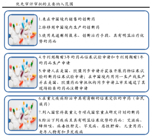 为了更好鼓励新药研发,提高药物疗效质量,更好地满足公众用药需要,国务院于15年8月发布了《国务院关于改革药品审评审批制度的意见 》(15年44号),44号文核心内容任务包括提高药品审批标准、推进仿制药质量一致性评价、加快创新药审评审批以及开展药品上市许可持有人制度试点(mah)。在前期征求大量意见的基础上,cfda于16年2月正式发布了《关于解决药品注册申请积压实行优先审评审批的意见》,从意见中公布的纳入优先审评审批条件来看,具有创新性且有临床价值的药物更能够获得“插队”审评审批的资格。