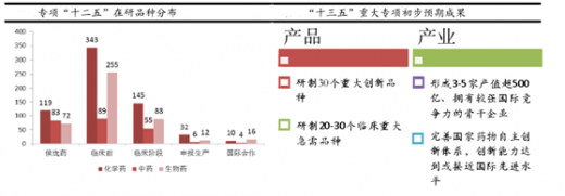 在“十一五”、“十二五”期间,新药专项计划通过部署支持了一批处于不同研发阶段的课题,形成了较为完整的产品研发线。通过“十二五”在研品种分布可以看见,与国内现有化药占绝对主导的药品现状不同,在研品种包括了许多中药、生物药品种,同时还有一部分国际合作项目。由于不同品种所处阶段不同,未来相当一段时间内预计仍陆续有成功品种上市,不乏重磅品种出现的可能性。此外,结合监管层通过不同渠道发布的信息整理,在“十三五”期间,新药创制专项计划仍将制定较高的预期目标:包括一批有重大价值的新药品种、培育创新型龙头企业、完善国内新药研发研发体系等。